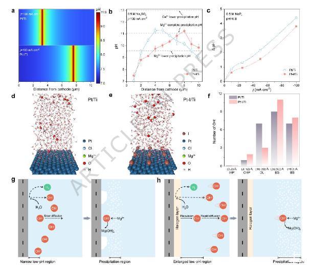 圖4、Pt-I/Ti電極局部反應(yīng)環(huán)境調(diào)控與超疏固性特性的機(jī)理研究。a.在100 mA cm?2電流密度下,Pt/Ti和Pt-I/Ti電極附近pH分布的COMSOL模擬圖。b.在100 mA cm?2的HER過程中,Pt/Ti和Pt-I/Ti電極表面pH值隨距離變化的微區(qū)測(cè)量結(jié)果。誤差棒為標(biāo)準(zhǔn)偏差。c.根據(jù)電解后開路電位(OCP)衰減瞬態(tài)計(jì)算的Pt/Ti和Pt-I/Ti電極的界面pH擺動(dòng)值。d,e.經(jīng)典分子動(dòng)力學(xué)(MD)模擬的快照,展示了在Pt暴露表面存在或不存在碘情況下的電解質(zhì)體系。f.根據(jù)經(jīng)典MD模擬結(jié)果得出的,在Pt和Pt-I暴露表面上方不同距離處的OH?數(shù)量。g,h.Mg(OH)?在Pt和Pt-I表面形成的示意圖。