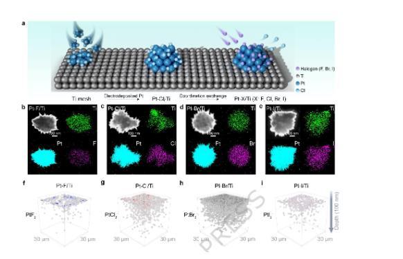 圖2、Pt-X/Ti(X:F,Cl,Br,I)的合成與表征。a.Pt-X/Ti合成過程的示意圖。b-f.(從左至右,上排)Pt-F/Ti,Pt-Cl/Ti,Pt-Br/Ti,Pt-I/Ti的EDS元素分布映射圖。g-i.(從左至右,下排)對(duì)應(yīng)的Pt-F/Ti,Pt-Cl/Ti,Pt-Br/Ti,Pt-I/Ti的3D TOF-SIMS圖像。