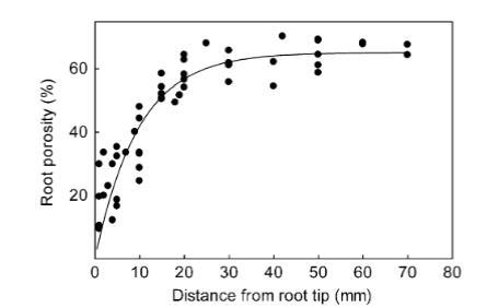 圖2 10條Lobelia dortmanna根的孔隙度隨距根尖距離的變化,以氣隙所占橫截面積的百分比表示。