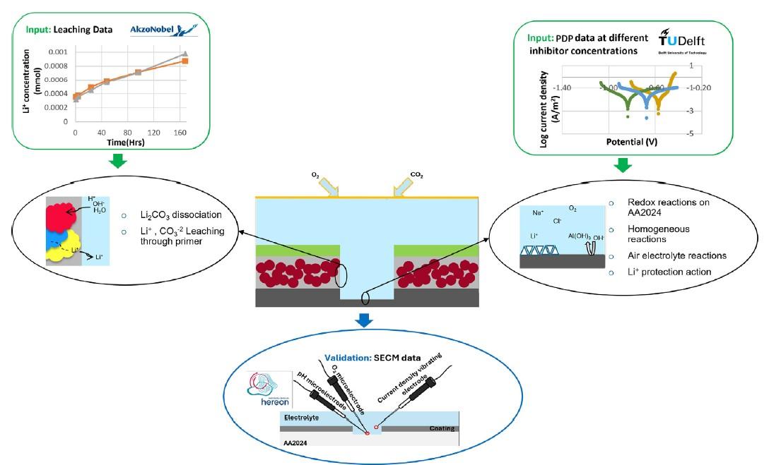 研究簡(jiǎn)介:六價(jià)鉻因致癌性被國(guó)際法規(guī)限制,急需開發(fā)綠色抑制劑。鋰碳酸鹽能在鋁表面形成偽勃姆石(PB)和層狀雙氫氧化物(LDH)保護(hù)層,但其釋放速率、局部pH變化及與涂層體系的協(xié)同作用尚不明確。本研究論文通過(guò)FEM模擬與微區(qū)電化學(xué)驗(yàn)證,填補(bǔ)了抑制劑在缺陷區(qū)內(nèi)動(dòng)態(tài)行為預(yù)測(cè)的空白。針對(duì)航空工業(yè)中傳統(tǒng)六價(jià)鉻腐蝕抑制劑的毒性問(wèn)題,提出以環(huán)保型鋰碳酸鹽(Li?CO?)作為替代方案,通過(guò)實(shí)驗(yàn)與有限元模型(FEM)相結(jié)合的方法,系統(tǒng)研究其在AA2024-T3鋁合金涂層缺陷中的腐蝕保護(hù)機(jī)制。研究旨在量化鋰碳酸鹽的釋放動(dòng)力學(xué)、局部保護(hù)效果及關(guān)鍵影響因素,為涂層設(shè)計(jì)提供理論依據(jù)。研究人員結(jié)合動(dòng)電位極化(PDP)與鋰浸出實(shí)驗(yàn)獲取模型輸入?yún)?shù),建立二維FEM模型(COMSOL Multiphysics),模擬電極反應(yīng)、物種擴(kuò)散及抑制劑釋放。模型涵蓋涂層(底漆+面漆)、電解質(zhì)和金屬界面,包含17種化學(xué)物種的反應(yīng)(如水解、鋰鹽溶解)。驗(yàn)證階段采用掃描電化學(xué)顯微鏡(SECM)和掃描振動(dòng)電極技術(shù)(SVET),實(shí)時(shí)測(cè)量缺陷區(qū)的pH、氧濃度和電流密度。本研究構(gòu)建了可擴(kuò)展的FEM工具箱,適用于其他抑制劑體系的預(yù)測(cè)。理論貢獻(xiàn)在于明確了鋰碳酸鹽保護(hù)的核心參數(shù)(Li?濃度、pH),但模型未涵蓋長(zhǎng)期LDH穩(wěn)定性及實(shí)際環(huán)境波動(dòng)數(shù)據(jù)。未來(lái)工作需整合合金異質(zhì)性,提升局部腐蝕預(yù)測(cè)精度。