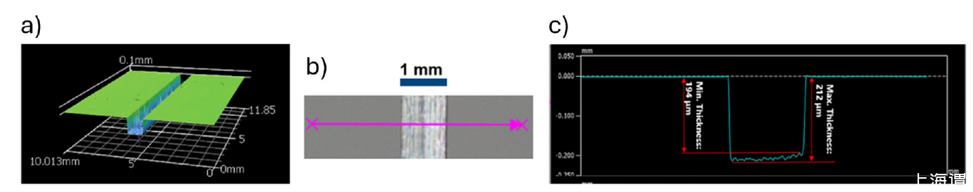 圖2、中間的劃痕到達(dá)合金基底。劃痕深度為200μm,寬度為1000μm,穿過(guò)涂層至裸合金表面。(a)輪廓測(cè)量圖;(b)涂層樣本的頂部光學(xué)照片;(c)帶劃痕樣本的橫截面輪廓。