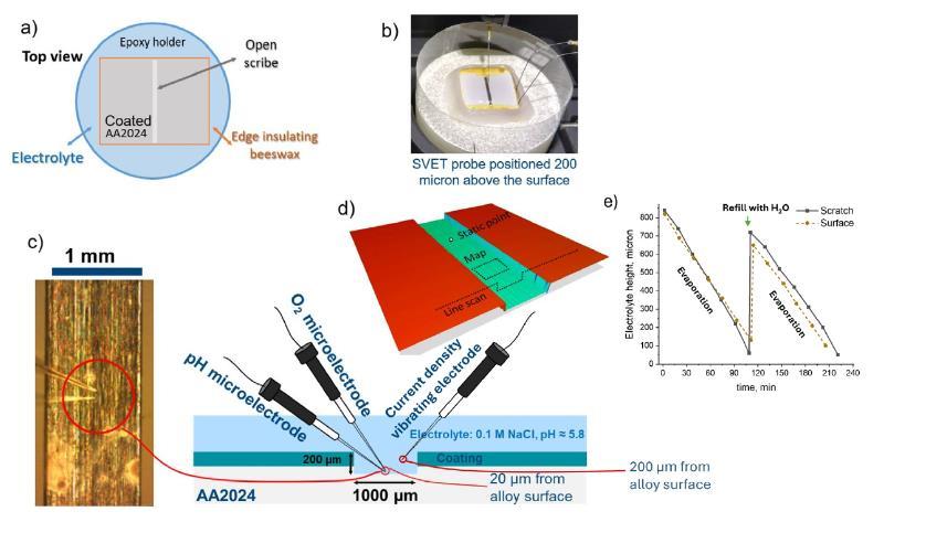 圖3、表面掃描微探針測(cè)量的實(shí)驗(yàn)裝置。(a)樣品在電解池中的示意圖,以及(b)中對(duì)應(yīng)的光學(xué)照片,顯示用于SVET測(cè)量的振動(dòng)微探針與參考電極和地電極。(c)劃痕區(qū)域的頂部光學(xué)顯微圖,顯示pH和O2微探針在劃痕中的位置,并附有劃痕內(nèi)pH和O2微電級(jí)位置的橫截面示意圖。(d)采用的實(shí)驗(yàn)掃描模式:時(shí)間上的“靜態(tài)點(diǎn)”測(cè)量、劃痕內(nèi)部的水平“圖譜”掃描,以及跨越涂層樣本的水平線掃描(包括將微探針降低至劃痕內(nèi)200μm)。(e)電解質(zhì)在表面測(cè)量過(guò)程中經(jīng)歷的蒸發(fā)和補(bǔ)充循環(huán)。