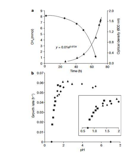 圖2|SolV菌株的生長(zhǎng)特性。a,典型生長(zhǎng)曲線顯示在pH 2和55°C條件下甲烷(圓形標(biāo)記)的減少和光密度(三角形標(biāo)記)的增加。該方程是通過(guò)數(shù)據(jù)點(diǎn)的最佳指數(shù)擬合。b,生長(zhǎng)速率與pH值的關(guān)系。插圖展示了pH值低于2時(shí)的數(shù)據(jù)放大圖。不同符號(hào)表示在不同日期進(jìn)行的實(shí)驗(yàn)。