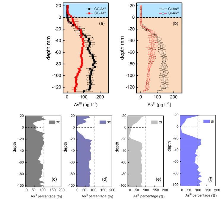 圖3、通過DGT方法測量得到的砷三價離子(a-b)濃度以及砷三價離子百分比(CDGT-AsIII/CDGT-As)(c-f)在對照土壤和硫酸處理土壤中的垂直分布情況。CC:持續淹水條件下的一般土壤;SC:持續淹水條件下高硫酸含量的土壤;CI:間歇性淹水條件下的一般土壤;SI:間歇性淹水條件下高硫酸含量的土壤。