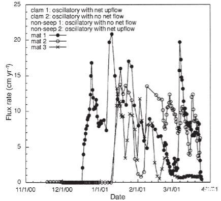 微生物墊地點的CAT計流體流動測量揭示了改造流體的顯著流出,沒有流動逆轉。在流動期間,平均速率為10厘米/年。然而,微生物墊地點在前2到3個月沒有流動,隨后4個月出現高度可變的流出。在這些地點排出的改造流體是微生物墊區域孔隙流體的典型特征。在蛤床和非滲漏地點之間沒有觀察到流體流動的差異。這些地點表現出高度可變的流動,伴有據信是潮汐產生的快速流動逆轉。雖然這些儀器無法在快速流動逆轉的環境中解析流速,但我們可以定性地確定是否存在凈上流、凈下流或無凈流。蛤床和非滲漏生境的總體凈流速較低(<1厘米/年)。