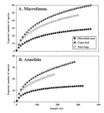 圖7. 稀疏曲線,顯示了來自微生物墊、蛤床和非滲漏沉積物的合并樣本的物種豐富度。