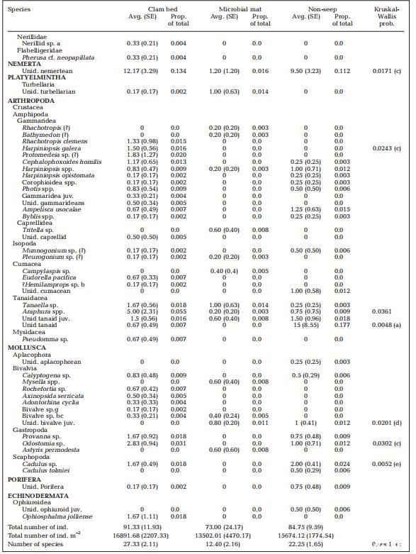 表1. 蛤床(cb)、微生物墊(mm)與非滲漏(ns)生境中大型動物(>300微米)在每個巖芯(54.08平方厘米×10厘米深度)的平均(標準誤)密度。采用Kruskal-Wallis檢驗分析微生物墊、蛤床與非滲漏生境間的差異,結(jié)果以卡方統(tǒng)計量表示。各分類單元概率值<0.05已標注,差異方向如下所示:(a)ns>cb+mm;(b)mm>cb+ns;(c)cb>ns+mm;(d)ns+mm>cb;(e)cb+ns>mm;Prop.:比例