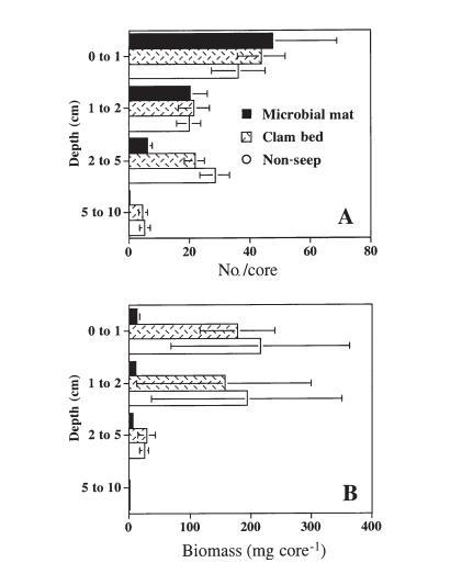 大型動物的垂直分布在生境間有所不同。大型動物(主要是dorvilleids)集中在微生物墊巖心的最上部沉積物中,64%的大型動物分布在0至1厘米層,91%分布在頂部2厘米。在蛤床和非滲漏沉積物中,分別只有48%和40%的大型動物個體存在于頂部1厘米。在非滲漏沉積物中,發現于2厘米以下的大型動物個體比例(38%)顯著高于微生物墊沉積物(9%以下)(反正弦百分比檢驗,p<0.0001),但蛤床的模式(29%在2厘米以下)與其他兩個微生境均無差異(p=0.162)。大型動物生物量在所有微生境中都集中在最上部2厘米。在dorvilleid多毛類中,蛤床沉積物中有46%的個體發現于2至10厘米;微生物墊沉積物中只有不到10%出現在2厘米以下。