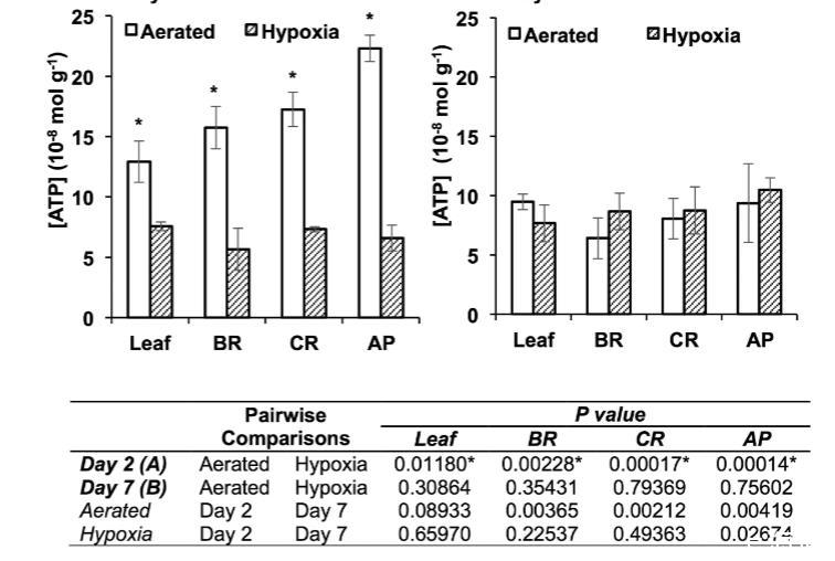 圖7.遭受低氧和通氣良好條件的煙草植株葉片以及根基部、根中部和根尖段的ATP水平。(A)處理2天后的ATP水平。(B)處理7天后的ATP水平。ATP水平通過檢測螢光素酶/螢光素反應(yīng)中的生物發(fā)光信號來確定。星號表示同一天同一組織中通氣良好與低氧處理之間ATP水平的顯著差異;下表列出了第2天與第7天之間比較的P值(ANOVA,Tukey檢驗(yàn),P≤0.05,n=6±標(biāo)準(zhǔn)誤)。
