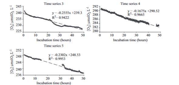 圖5顯示了在時間序列3-時間序列5平行進行的暗培養期間,使用氧微電極測量的連續氧下降。結果與離散溫克勒培養獲得的結果非常一致,表明在大約50小時的三個連續暗培養過程中,氧濃度普遍呈線性下降。時間序列5中氧消耗斜率的重大變化(從14到32小時)被排除,因為它們是由水浴冷卻系統故障導致的夜間溫度變化引起的。一旦水浴溫度再次達到初始溫度+0.2°C,重新記錄數據。在時間序列3期間也觀察到微小的變化,包括培養開始時和培養24小時后。斜率的初始變化可能與樣品制備操作后逐漸冷卻有關。然而,這些結果未被刪除,因為我們沒有假定溫度變化的精確證據。