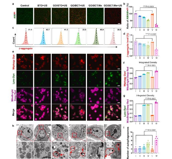 圖4、Go/BCT:Mn MDM與CT26細(xì)胞的相互作用。a,CT26細(xì)胞與不同PZNPs共培養(yǎng)的CT26細(xì)胞(從左到右,對(duì)照組和實(shí)驗(yàn)組:BTO+US、GO/BTO+US、GO/BCT+US、GO/BCT:Mn和GO/BCT:Mn+US)共培養(yǎng)12小時(shí)后,CT26細(xì)胞共培養(yǎng)12小時(shí)后,進(jìn)行活/死染色(1.5 W/cm2,1 MHz,50%占空比)。處理后的細(xì)胞用AM(活細(xì)胞,綠色)和PI(死亡細(xì)胞,紅色)染色。比例尺:200微米b,AM/AM+PI熒光定量,見圖a。c,CT26細(xì)胞通過超聲波處理不同PZNP(1.5 W/cm2,1 MHz,占空比50%)處理,隨后進(jìn)行線粒體膜電位變化的流式細(xì)胞術(shù)分析。流式細(xì)胞術(shù)分析顯示CT26細(xì)胞線粒體膜電位(以形成J-聚集體數(shù)量表示)發(fā)生變化。d,流式細(xì)胞術(shù)中J-聚集體的相對(duì)定量。e,評(píng)估PZNPs孵育和超聲刺激后CT26細(xì)胞絲足吞噬作用。比例尺:20微米。f,自噬體與線粒體比值定量。溶酶體與線粒體比值的定量分析。g,溶酶體與線粒體比值的定量分析。h,TEM用于評(píng)估PZNP孵育和超聲刺激后CT26細(xì)胞自噬體形成。