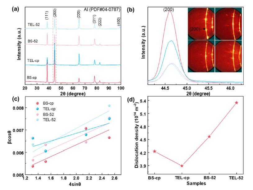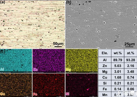 圖2、7075鋁合金的微觀結構。(a)光學顯微鏡(OM)圖像:顯示軋制形成的伸長晶粒和部分再結晶的等軸晶。(b)SEM圖像及EDS元素分布。