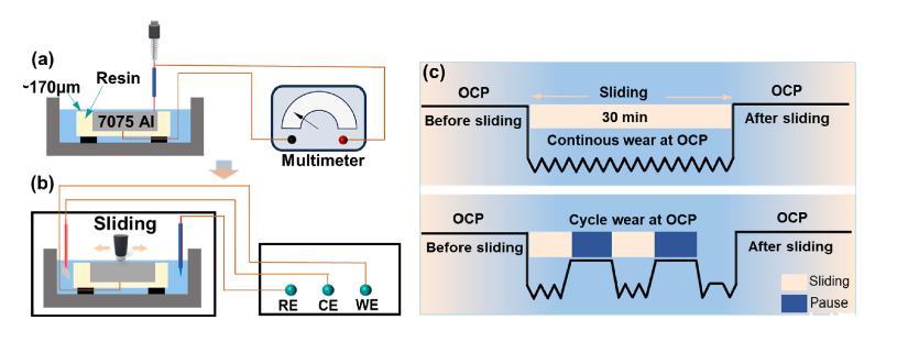 圖1.實驗裝置示意圖。(a)薄電解質層(TEL)厚度測量原理:通過鉑針與萬用表連接,控制TEL厚度為170±5μm(模擬海洋大氣中最嚴酷的腐蝕條件)。(b)TEL環境下的摩擦腐蝕實驗裝置:采用三電極體系(工作電極為7075鋁合金,對電極為鉑片,參比電極為Ag/AgCl飽和電極),摩擦頻率1 Hz,載荷5 N。(c)摩擦腐蝕程序:包括連續滑動模式(如BS-ocp、TEL-ocp)和間歇滑動模式(如BS-52、TEL-32),用于研究合金的再鈍化能力。