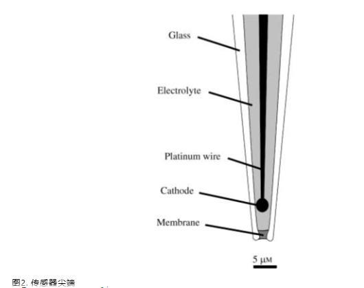 用于測量氧氣微梯度的裝置(概覽見圖1)購自丹麥優尼森的Unisense A/S公司。它包括一個氧微傳感器,由電機驅動并通過計算機控制的微操縱器固定,安裝在培養箱內的倒置顯微鏡上。氧微傳感器(OX10 Clark型)尖端直徑為10微米(圖2),并配備保護陰極(圖中未顯示),以防止電解質儲液器中的氧氣擴散到氧傳感陰極(Revsbech 1989)。傳感器充滿電解質以屏蔽信號免受電化學場干擾,因此無需使用噪聲屏蔽法拉第籠。使用時,氧氣通過硅膠尖端膜擴散到氧還原陰極,該陰極相對于內部Ag/AgCl陽極極化。從陽極到氧還原陰極的電子流線性反映了傳感器尖端近端的氧分壓。產生的微弱電流(10^-12至10^-10安培)由靈敏的皮安計PA2000測量。該皮安計配有兩個通道,并內置極化源。