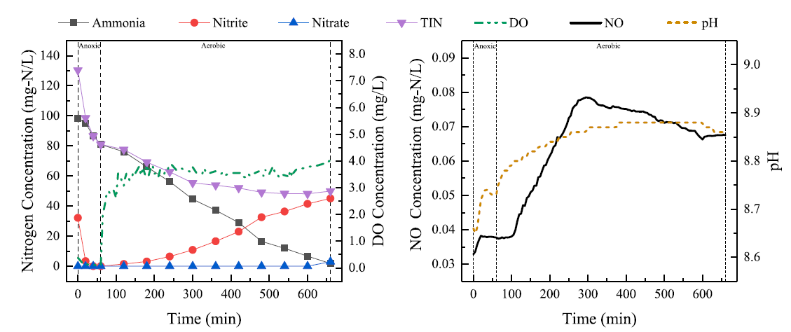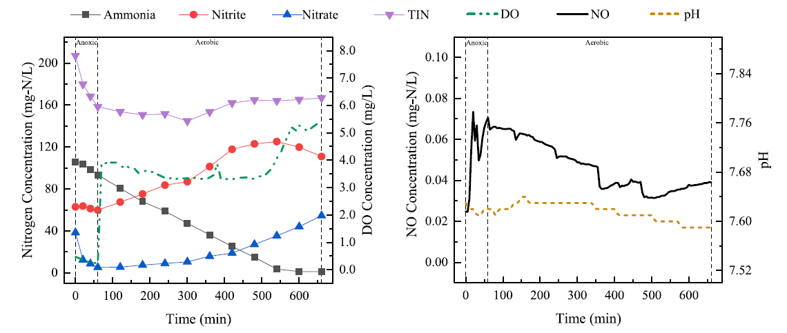 圖3、在典型循環(huán)(第一階段穩(wěn)定運行期間)放電率為20%時,氨、亞硝酸鹽、硝酸鹽、TIN、DO、NO和N 2 O水平以及pH值的變化。