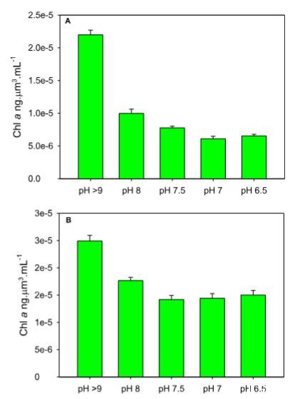 圖5- 在溶解無機碳梯度下,A) 以微球藻(Micractinium bornhemisense)為主的培養(yǎng)物和B) 以盤星藻(Pediastrum boryanum)/倒刺柵藻(Desmodesmus opoliensis)為主的培養(yǎng)物中,歸一化至微藻生物體積的葉綠素a(Chl-a)含量。