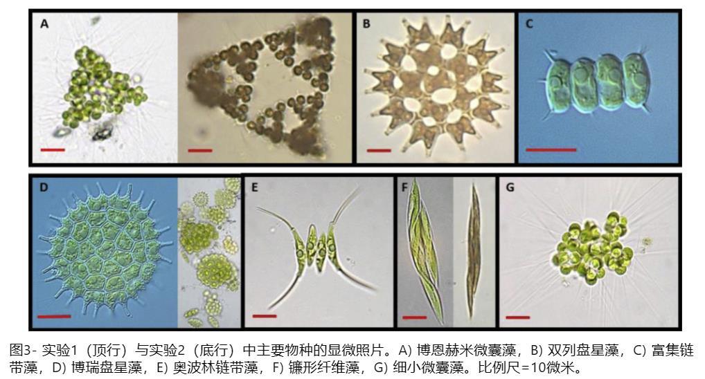 僅觀察到綠藻門(綠藻)。在實驗1中,博赫米微囊藻(Micractinium bornhemiense (W.Conrad) Korshikov)是優(yōu)勢種,在所有高分辨率藻類監(jiān)測系統(tǒng)中約占微藻生物體積的90%(范圍85-93%)。博赫米微囊藻是一種群體性綠微藻,其細胞規(guī)則排列成金字塔形定形群體,包含8至256個球形細胞,每個細胞帶有單根刺突(圖3a)。這類群體性綠微藻雙形盤星藻(Pediastrum duplex Meyen)(占6%;圖3b)和豐富柵藻(Desmodesmus abundans (Kirchner) E. Hegewald)(占4%;圖3c)構(gòu)成了剩余微藻生物體積。