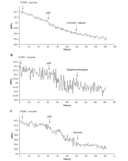 圖6、在存在姜黃素、EGCG或槲皮素的情況下測(cè)量純化視桿細(xì)胞外段的呼吸速率。視桿細(xì)胞外段中耦合呼吸速率的代表性電流記錄軌跡。添加物為NADH(0.2 mM)、琥珀酸鹽(20 mM)和ADP(0.1 mM)。然后在(A)中加入姜黃素和胡椒堿(各100 μM);在(B)中加入EGCG(100 μM);在(C)中加入槲皮素(100 μM)。反應(yīng)體積為1.7 mL,使用約40 μg總視桿細(xì)胞外段蛋白。