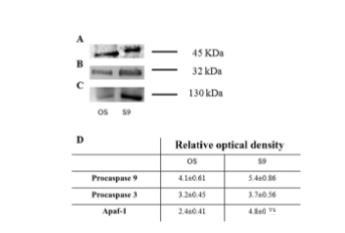 圖8、procaspase 9、procaspase 3和Apaf-1的半定量Western印跡分析。(A-C) 抗procaspase 9、procaspase 3和Apaf-1抗體的半定量Western印跡信號(hào)。樣品為分離的視桿細(xì)胞外段(OS)和線粒體富集部分(M)。(D) 使用ChemiDoc軟件(Bio-Rad Laboratories)進(jìn)行的光密度分析。每個(gè)值為平均值±標(biāo)準(zhǔn)差;n=6。