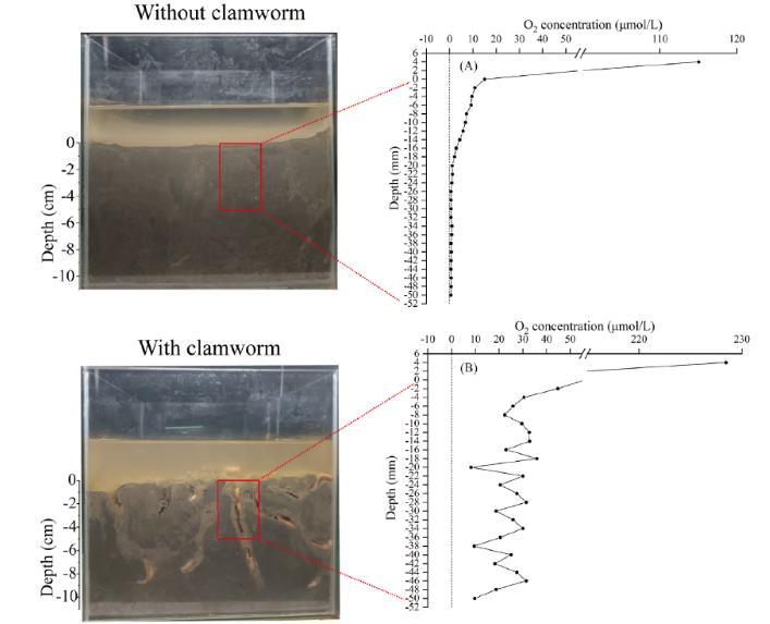 圖1、沉積物內氧氣剖面圖。無沙蠶(A)或有沙蠶(B)沉積物的氧氣剖面圖。結果顯示,無沙蠶沉積物中氧氣濃度隨深度增加急劇下降,在約20毫米處降至不可檢測水平(<1 μmol/L)。而在有沙蠶存在時,氧氣滲透深度超過50毫米,且氧氣水平穩定并顯著更高(25.26±8.5 μmol/L)。這表明沙蠶的掘穴行為促進了氧氣向沉積物深層的擴散。