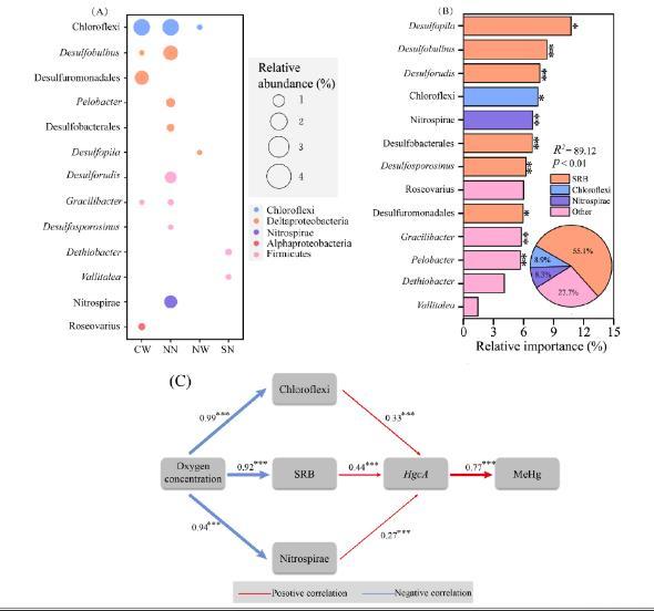 圖5、(A)不同處理中假定的汞甲基化酶的相對豐度。圓圈大小代表每個組中歸屬于特定屬或門的 hgcA 基因序列的相對豐度。(B)RF 分析用于預測與甲基汞生成相關的不同汞甲基化酶的重要性。相同顏色的條表示同一組。單星號和雙星號分別表示在 p < 0.05 和 0.01 時的顯著差異。(C)SEM 描繪了氧氣濃度和主要汞甲基化酶對甲基汞生成的貢獻。紅色和藍色箭頭分別表示正相關和負相關關系。數字表示標準化路徑系數。