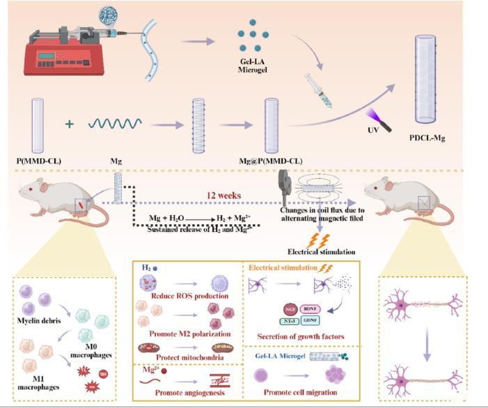 圖1、構建一種能釋放氫氣以改善周圍神經再生微環境的電活性神經導管的示意圖。在周圍神經損傷后,炎癥反應和氧化應激會抑制周圍神經的再生。PDCL-Mg 降低了活性氧水平,促進了巨噬細胞極化,加速了血管生成,加速了生長因子的釋放,并促進了大鼠的再生微環境、神經再生和運動功能的恢復。