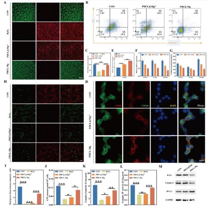 圖5、H2 在體外的抗炎、抗氧化和促進能量代謝的作用。(A)RSCs 在與材料和 400 μM 的 H2O2 共培養 12 小時后進行 LIVE-DEAD 染色的圖像。比例尺為 100 微米。(B)使用流式細胞術觀察細胞。(C)培養有 PDCL-Mg 和 400 μM 的 H2O2 的 RSCs 12 小時后的活性氧(ROS)檢測(n = 3)。(D)用 PDCL-Mg 處理的 RAW 264.7 細胞的 CD206 免疫熒光染色圖像。比例尺為 10 微米。(E)CD206 的熒光強度(n = 3)。(F)RAW264.7 細胞在第 2 天經由水凝膠處理后(LPS 刺激后)M1 相關基因 TNF-α、IL-1β 和 NF-κB 的相對 mRNA 表達(n = 3)。(G)從 RAW264.7 細胞中處理水凝膠后的第 2 天(LPS 刺激后)的促炎性細胞因子 TNF-α、IL-1β 和 NF-κB 的 ELISA 分析(n = 3)。(H)通過 JC-1 熒光探針檢測 RSCs 的熒光圖像。比例尺為 100 微米。(I)線粒體膜電位檢測(n = 3)。(J)通過 ATP 檢測試劑盒檢測 RSC 細胞中的 ATP 含量(n = 3)。(K)通過 WB 檢測 RSC96 細胞中 BAX、Caspase3 和 BCL2 的表達。