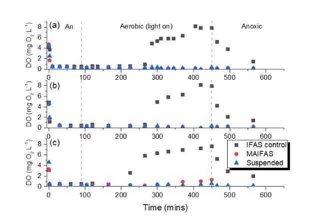 圖3-4. 生長(a) 30天, (b) 60天 和 (c) 90天后一個SBR周期內的DO濃度。在好氧階段對IFAS對照進行機械曝氣。在好氧階段對MAIFAS和懸浮反應器施加76.2 μmol m?2 s?1的熒光燈光照(無機械曝氣)。