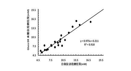 圖3、臨床前全血檢測(cè)對(duì)比實(shí)驗(yàn)。對(duì)于不同全血樣品,將新型電化學(xué)微電極自制儀表檢測(cè)與血糖儀(GlucoDR)進(jìn)行了對(duì)比測(cè)試,相關(guān)系數(shù)為0.975。