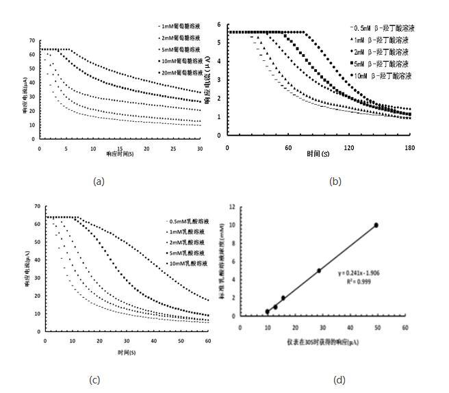 圖2、基于電化學(xué)微電極技術(shù)開(kāi)展糖尿病相關(guān)參數(shù)標(biāo)準(zhǔn)物質(zhì)響應(yīng)機(jī)制和校準(zhǔn)測(cè)試。(a)對(duì)不同濃度葡萄糖標(biāo)準(zhǔn)溶液測(cè)試響應(yīng)曲線;(b)對(duì)不同濃度酮體(β-羥丁酸)標(biāo)準(zhǔn)溶液測(cè)試響應(yīng)曲線;(c)對(duì)不同濃度乳酸標(biāo)準(zhǔn)溶液測(cè)試響應(yīng)曲線;(d)對(duì)乳酸響應(yīng)的校準(zhǔn)曲線