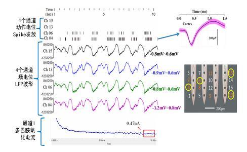 圖6、基于植入式電化學(xué)和電生理雙模微電極陣列技術(shù),開(kāi)展大鼠腦部紋狀體電生理及多巴胺雙模在體檢測(cè)實(shí)驗(yàn)。