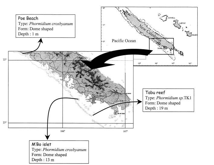微生物巖樣品是在現場根據對圓頂狀色素沉著菌落(在藻類文獻中稱為“葉狀體”)的宏觀識別采集的,基于S. Golubic的描述。研究的微生物巖是由屬于席藻屬的單一種群絲狀藍藻產生的,即Phormidium crosbyanum Tilden和Phormidium sp.TK1。Phormidium sp.TK1和P. crosbyanum的微生物巖穹窿分別采集于新喀里多尼亞西南瀉湖的13米水深(Tabu Reef)和19米水深(M'Bo islet)。另一個P. crosbyanum分離株采集于努美阿以北約200公里的布賴爾附近一個非常淺的后礁環境(Poe beach)。在這些瀉湖和后礁環境中,微生物穹窿在沙質沉積物上發育,并與綠藻(仙掌藻)、絮狀藍藻席和海草(Halophilda)相關,較少在珊瑚碎片和活的塊狀珊瑚群體上;它們通常覆蓋在Opuntia仙掌藻的葉狀體上。