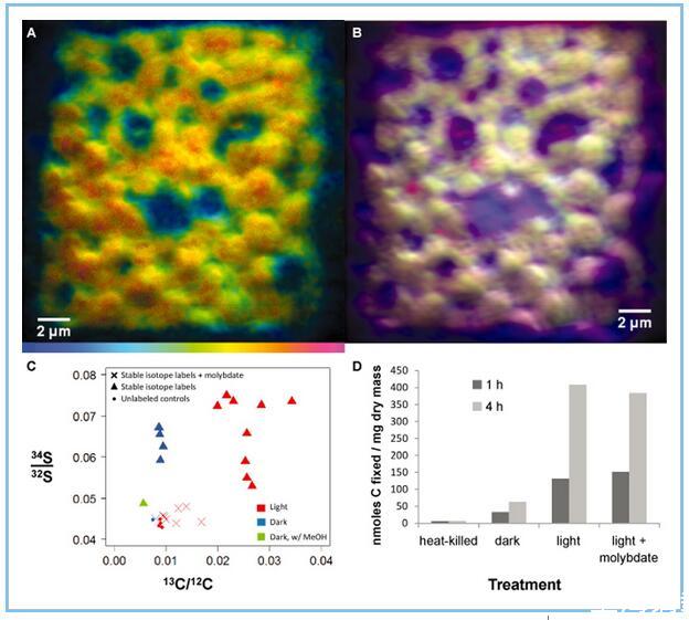 為了跟蹤聯盟成員之間硫代謝和循環的活動,將新鮮收集的粉紅色漿果與下厭氧培養34富含S的硫酸鹽和富含13 C的碳酸氫鹽在光照和黑暗條件。,富集34培養4天后S在形態獨特的PB-PSB1細胞中的很明顯(圖8A和B)。的34 S/32這些細胞中S比率大約是未標記對照條件下觀察到的兩倍。發現該信號在甲醇中不穩定(圖甲醇8 C),是一種用于定量萃取元素硫的溶劑(Ferdelman等,1997)。富集34 S IN光亮和黑暗孵育(圖中記載8 C)。