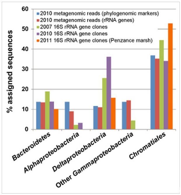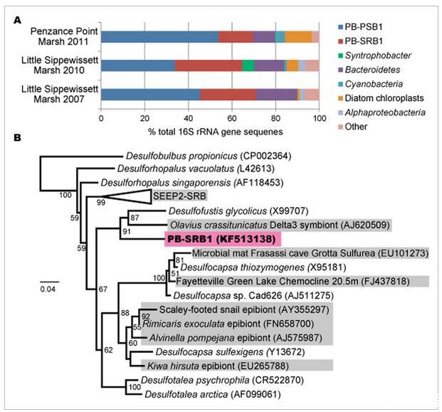 A.16S rRNA基因序列從粉紅色漿果中分離出來,這些漿果采集于2011年(89克隆)彭贊斯角沼澤,2010年(94克隆)和2007年(90克隆)Little Sippewissett沼澤。兩個操作分類單元(OTU),紫硫細菌(PB-PSB1)和硫酸鹽還原菌(PB-SRB1),占觀察到的序列的60%以上。