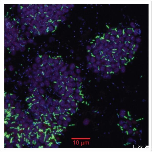 使用系統發育特異性探針通過催化報告基因沉積-熒光原位雜交(CARD-FISH)鑒定漿果相關的PB-SRB1物種。掃描共聚焦顯微照片顯示了來自聚集體外圍附近的粉紅色漿果生物量的橫截面。該圖像是三個熒光信號的疊加:自發熒光紫硫細菌(以粉紅色顯示,激發543 nm,發射550–570 nm),來自SRB-PiBe213探針的CARD-FISH信號(以綠色顯示,Alexa 488酪胺)和DAPI核酸染色劑(以藍色顯示)。
