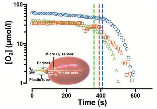 花梗在氣體擴散到Ruby Seedless葡萄中的作用(2016-2017季節為132 DAA)。三個單獨漿果的[O2]作為時間的函數,傳感器插入大約Ruby Seedless的中心軸,距花梗約2毫米。虛線表示在花梗上開始外部N2氣體輸送。不同的符號表示不同的漿果。插圖:在測量[O2]的同時在漿果花梗上施加N2氣體的實驗裝置。