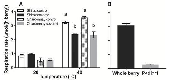 花梗在氧擴散中作為溫度的函數的作用。(A)霞多麗(86 DAA)和設拉子(77 DAA)漿果(每個漿果)在20°C和40°C下的呼吸作用,并附有花梗(2016-2017季節)。硅脂覆蓋花梗上的皮孔(覆蓋漿果)。在20°C下,兩個品種的對照和花梗覆蓋的漿果之間的表觀漿果呼吸沒有顯著差異。不同的小寫字母表示每個品種在40°C處理之間的顯著差異(雙向方差分析,P<0.0001)。Shiraz和Chardonnay降低了839.7±101.8 nmol h–1和1377.3±161.3 nmol h–1在40°C下的呼吸作用中,每個漿果的呼吸作用分別(降低了26%和39%)。(B)整個漿果的呼吸速率,包括附著的花梗和霞多麗在40°C下的分離花梗的呼吸。花梗占整個漿果呼吸率的9%。數據是平均值±SE,n=3。