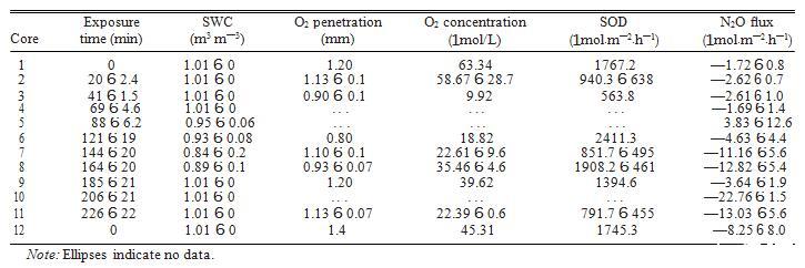表 1. 美國(guó)馬薩諸塞州北岸海洋潮間帶泥灘的沉積物含水量 (SWC) 和氧氣特性,以及整個(gè)低潮期間的沉積物需氧量 (SOD) 和 N2O 通量。