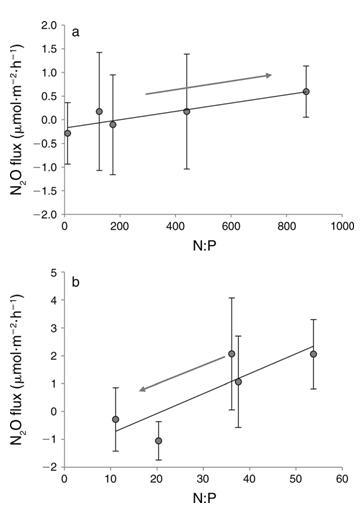 3. (a) DIN (y 0.0009x 0.18, R2 0.82, P 0.034) 和 (b) DIN DIP 添加量 (y 0.072x 1.5, R2 0.71, P 0.07) 的淹沒 N2O 通量與 N 與 P 的比率。 箭頭表示處理方向(從低到高的營養添加)。 誤差線表示 6SE,請注意不同的比例。