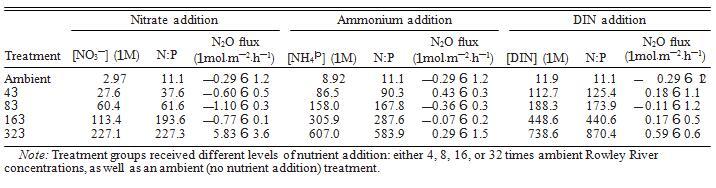 表 2. 每種處理的養分處理濃度、溶解無機氮 (DIN) 與溶解無機磷 (DIN DIP) 的比率,以及每個實驗處理和處理水平下淹沒核心的 N2O 通量。