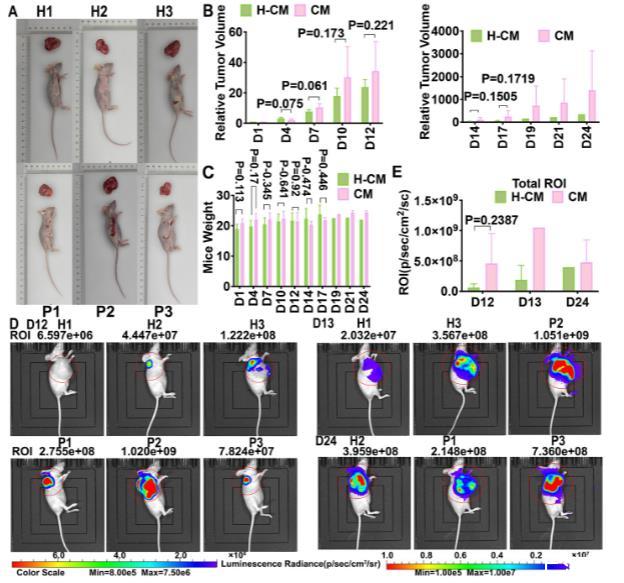 接下來,我們旨在確定飲用富氫水是否會抑制子宮內膜癌小鼠模型中的腫瘤生長。九只 BALB/c 小鼠在右肩皮下植入 1x10^7 個 AN3CA-LUC 細胞,并每天自由飲用濃度為 1.0 ppm 的富氫水(HRW:H1, H2, H3, H4, H5, H6)或純化水正常對照(NC:P1, P2, P3)。腫瘤于 2019 年 3 月 31 日在 H1、H2、H3 和 P1、P2、P3 小鼠身上開始生長,而腫瘤于 2019 年 5 月 13 日在 H4、H5 和 H6 小鼠身上開始生長。出于倫理考慮,H1、H3 和 P2 小鼠在體積增加到 770.73-901.69 mm3 時于第 14 天處死,H4、H5 和 H6 小鼠在體積增加到 2317.83-4456.70 mm3 時于第 17 天處死,因此我們記錄了 H2、P1、P3 小鼠 24 天的數據,H1、H3、P2 小鼠 14 天的數據,以及 H4、H5、H6 小鼠 17 天的數據。