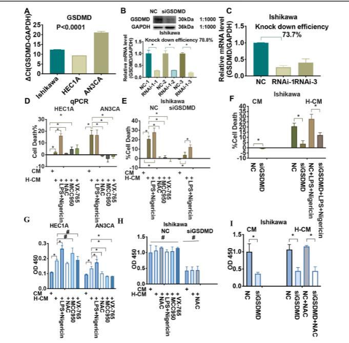 我們通過使用攜帶 GSDMD shRNA 的慢病毒轉染 Ishikawa 細胞(包括三對 GSDMD 基因 shRNA 干擾片段(RNAi-1、RNAi-2 和 RNAi-3)以及一對陰性對照(NC))進行了 GSDMD 敲低實驗。蛋白質印跡分析顯示,與 NC 組相比,GSDMD 敲低的 Ishikawa 細胞中 GSDMDNterm 蛋白水平下調(圖 6b)。選擇轉染效率提高(78.8%)的 RNAi-1 用于后續實驗(圖 6a-c)。