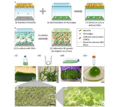 圖1、通過細菌(K. hansenii)和微藻(C. reinhardtii)共培養,生成基于 BC 的生物復合材料。(a)示意圖,展示(i)細菌單一培養,(ii)微藻單一培養,以及在無纖維素納米晶體 (CNC)的情況下,細菌纖維素(BC)生產僅限于空氣-液體界面和微藻沉積物,且靜止條件下進行。(b) 基于 BC 的生物復合材料制造策略示意:在 CNC 存在下靜態培養共培養,實現了在培養容器內分布式的氧合和 BC 體積增長。(c) 基于不同形狀的 BC 生物復合材料通過在對應幾何形狀的容器中培養共培養物獲得:(i) 在垂直方向的 T75 培養瓶中生產的厚塊生物復合材料;(ii)在含有共培養懸浮液的透氣硅膠管內形成的絲狀生物復合材料;(iii) 在水平放置的 T175 培養瓶中形成二維片;(iv)在 50 毫升錐形管內形成的錐形生物復合材料。(比例桿=1 厘米)。(d)代表性光學顯微圖像,用于 BC 基生物復合材料的橫截面,代表微藻細胞成功融入 BC 分層結構。(比例桿 = (i) 25 微米;(ii) 10 微米)。