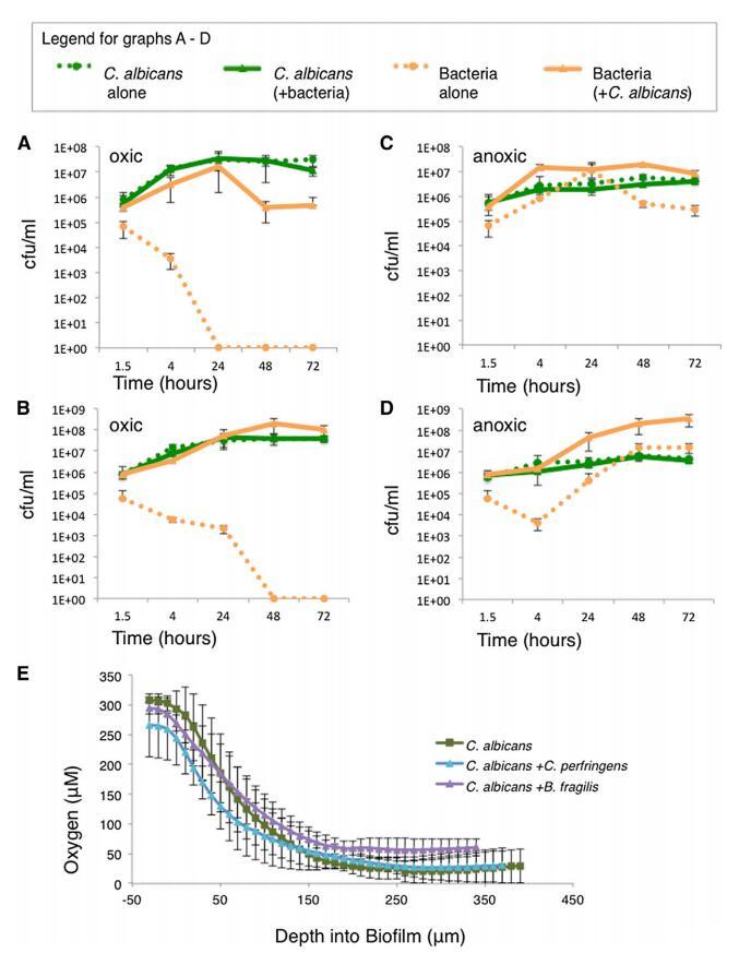 圖 2. 混合物種生物膜提供了一個 厭氧菌生長的利基 (A–D) 在生物培養(yǎng)基中生長的指定物種的 cfu/ml 單養(yǎng)或共養(yǎng)的薄膜在好氧或 缺氧條件。 細胞是從生物 僅薄膜(不是來自生物膜上方的介質(zhì)) 在 1.5、4、24、48 和 72 小時并鍍上 cfu。 (A) C. albicans 和/或 C. perfringes in oxic 狀況。 (B) C. albicans 和/或 B. fragilis in oxic 狀況。 (C) 缺氧條件下的白色念珠菌和/或產(chǎn)氣莢膜梭菌 狀況。 (D) C. albicans 和/或 B. fragilis 在缺氧條件下。 (E) 在組成的生物膜中測量氧氣 使用 STOX 傳感器檢測指定物種。 從頂部每 10 毫米讀取一次讀數(shù) 到生物膜的底部。 對于所有圖形,至少兩次重復(fù)的平均值 顯示,誤差條顯示 SD。 也可以看看 圖 S2。