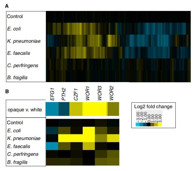 差異最大的基因是那些 編碼控制白色透明開關(guān)的轉(zhuǎn)錄調(diào)節(jié)因子。白色念珠菌,兩個細胞之間的過渡 類型,每種類型都可以遺傳多代 [15-18](圖 3B)。 特別是 WOR1,它對“主”進行編碼 白色不透明轉(zhuǎn)換的調(diào)節(jié)器,被強烈上調(diào) 通過與肺炎克雷伯菌、大腸桿菌和糞腸球菌共培養(yǎng)。 與肺炎克雷伯菌共培養(yǎng)也誘導(dǎo)了幾個 其他已知的轉(zhuǎn)錄調(diào)節(jié)因子在 白色不透明開關(guān),以獨立于 WOR1 的方式(圖 S3;數(shù)據(jù)集 S2)[14, 17, 19-21]。