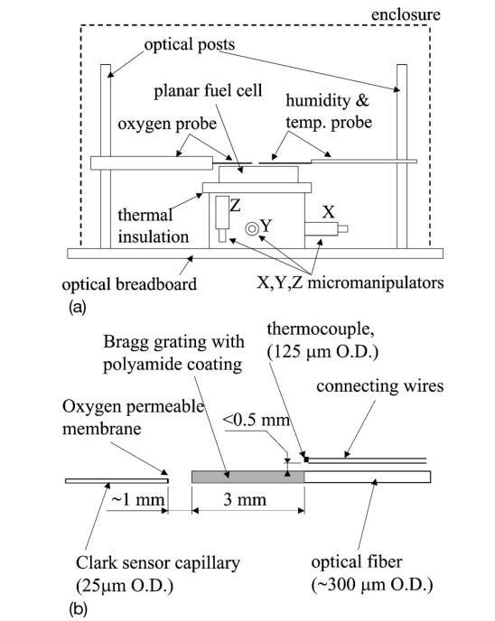 實驗裝置。-圖3a示意性地說明了吸氣式燃料電池陰極微傳感器探測實驗的配置。平面空氣呼吸燃料電池安裝在XYZ微操作臺的頂部,開放陰極朝上。電池通過絕緣層與XYZ級進行熱絕緣,并通過外殼與環境進行對流屏蔽。溫度、氧分壓和相對濕度傳感器安裝在剛性光學柱上,然后將其固定在剛性光學實驗板上。所有三個傳感器都對齊,以便它們會聚在空氣呼吸燃料電池陰極中心部分上方區域的小體積空間上。傳感器的相對位置在圖3b中以放大的細節示出。吸氣式燃料電池被放置在光學XYZ級上,與同一光學板底座相連,確保堅固、機械完整、剛性裝配。XYZ工作臺允許精確控制陰極表面和傳感器之間的位移。克拉克毛細管傳感器和光纖布拉格傳感器以共線方式布置,傳感器尖端之間的間距小于一毫米。熱電偶導線在空氣中與光纖平行并位于光纖上方。實際熱電偶位于光纖上方不到半毫米的布拉格光柵起點處。整個實驗裝置被保護在一個部分封閉結構內,以最小化實驗室環境中發生的強制流動對燃料電池陰極上方自然對流羽流的影響。