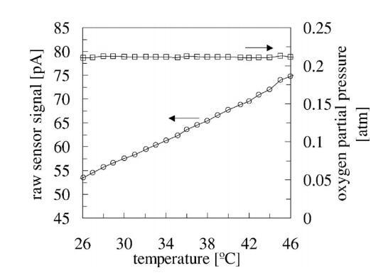圖1. 氧氣微傳感器電流輸出和溫度曲線圖校準氧氣濃度與空氣溫度的函數關系。
