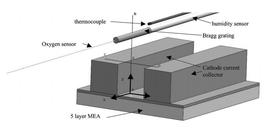 在極化、輪廓和瞬態測量期間,平面陰極和傳感器組件的相對位置如圖4所示。傳感器組件由氧傳感器毛細管、帶濕敏布拉格光柵的光纖和帶導線的熱電偶組成。傳感器總是相互平行布置,并帶有陰極肋。在所有實驗中,傳感器之間的相對布置保持不變。幾何點A(y=0毫米,z=0毫米),B(y=0毫米,z=6毫米),C(y=?1.52 mm,z=-0.16 mm),D(y=1.52 mm,z=0.16 mm)和E(y=0 mm,z=1.6 mm)定義了實驗期間傳感器組件的軌跡和位置(由布拉格光柵的幾何中心參考)(對于所有實驗,x=0 mm)。線EB和CD分別代表z(垂直)和y(水平)遍歷期間傳感器組件的軌跡。使用改進的傳感器組件沿AB線測量z橫向相對濕度。在偏振和瞬態掃描期間,傳感器組件位于E點。坐標系的中心位于陰極活動區域的幾何中心,光纖接觸陰極網格的頂部。