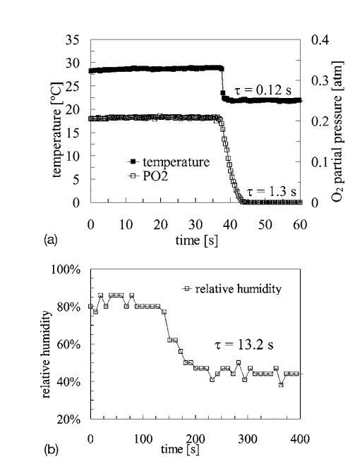 圖5.(a) 溫度和PO2微傳感器的瞬態響應,(b)相對濕度微傳感器的瞬態響應。