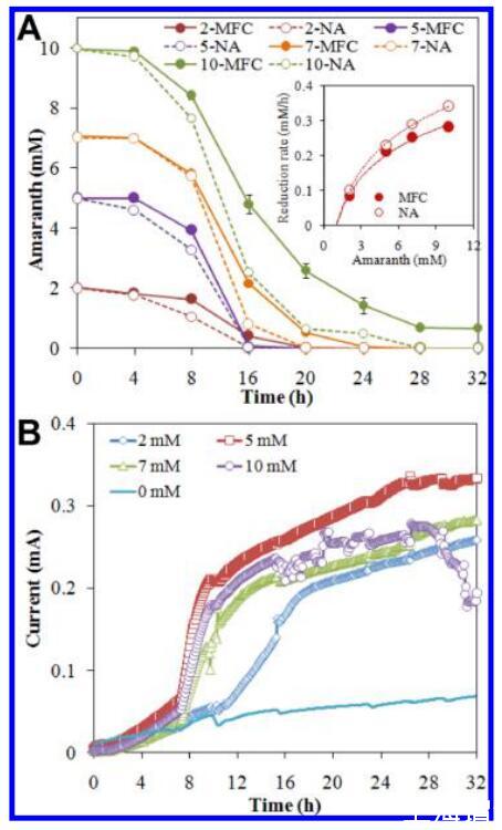 圖1。 同時(shí)減少莧菜紅和電流產(chǎn)生。 (A) 在MFC(實(shí)線(xiàn))和NA反應(yīng)器(虛線(xiàn))中還原不同濃度的莧菜紅。 插圖顯示了MFC和NA反應(yīng)器中莧菜紅的還原速率。 (B) 含有不同濃度莧菜紅的MFC中的當(dāng)前世代。